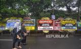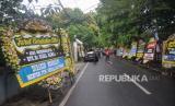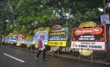 Sejumlah orang melintas didekat karangan bunga untuk almarhum Mantan Menteri Koordinator (Menko) Bidang Kemaritiman Rizal Ramli di kediamannya Jalan Bangka IX, Jakarta Rabu (3/1/2023). Rizal Ramli mengembuskan napas terakhir dalam usia 69 tahun di Rumah Sakit Cipto Mangunkusumo (RSCM) Jakarta pada Selasa (2/1/2024) malam dan akan dimakamkan di tempat pemakaman umum (TPU) Jeruk Purut, Jakarta pada Kamis (4/1/2024). (FOTO : Republika/Prayogi)