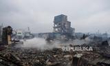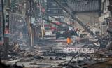 Orang-orang berjalan di tengah sisa-sisa bangunan yang terbakar akibat kebakaran yang terjadi setelah gempa bumi kuat di Wajima, Jepang tengah, Rabu, (3/1/2024). (FOTO : EPA-EFE/JIJI PRESS )