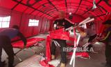 Petugas memasang peralatan medis di tenda medis bagian dari rumah sakit darurat di halaman Rumah Sakit Umum Daerah (RSUD) Sumedang, di Kabupaten Sumedang, Jawa Barat, Rabu (3/1/2023). Pasca gempa Magnitudo 4.8 jelang Tahun Baru pekan lalu, gempa susulan masih mengguncang wilayah Kabupaten Sumedang. Terakhir, gempa berkekuatan lebih rendah Magnitudo 2,3 terjadi Rabu dini hari. Saat ini semua pihak dan unsur terkait tetap waspada dengan membangun sejumlah fasilitas darurat. (FOTO : Edi Yusuf/Republika)
