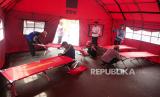 Petugas mempersiapkan sejumlah fasilitas di tenda darurat untuk pasien di halaman Rumah Sakit Umum Daerah (RSUD) Sumedang, di Kabupaten Sumedang, Jawa Barat, Rabu (3/1/2023). Pasca gempa Magnitudo 4.8 jelang Tahun Baru pekan lalu, gempa susulan masih mengguncang wilayah Kabupaten Sumedang. Terakhir, gempa berkekuatan lebih rendah Magnitudo 2,3 terjadi Rabu dini hari. Saat ini semua pihak dan unsur terkait tetap waspada dengan membangun sejumlah fasilitas darurat. (FOTO : Edi Yusuf/Republika)