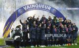 Para pemain PSG melakukan selebrasi usai memenangi laga final Piala Super Prancis antara Toulouse melawan Paris Saint-Germain di Parc des Princes di Paris, Kamis (4/1/2024) dini hari WIB (FOTO : AP Photo/Michel Euler)