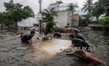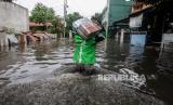 Petugas Sudin SDA berjalan melewati banjir di Pondok Karya, Mampang, Jakarta Selatan, Kamis (4/1/2024). Banjir setinggi 80 sentimeter tersebut diakibatkan hujan dengan intensitas tinggi di wilayah Jakarta Selatan hingga membuat aliran air dari Kali Krukut meluap. (FOTO : Republika/Putra M. Akbar)
