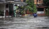 Pengembudi ojek online berjalan melewati banjir untuk mengantarkan paket di Pondok Karya, Mampang, Jakarta Selatan, Kamis (4/1/2024). Banjir setinggi 80 sentimeter tersebut diakibatkan hujan dengan intensitas tinggi di wilayah Jakarta Selatan hingga membuat aliran air dari Kali Krukut meluap. (FOTO : Republika/Putra M. Akbar)