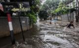 Anak-anak bermain air saat terjadi banjir di Pondok Karya, Mampang, Jakarta Selatan, Kamis (4/1/2024). Banjir setinggi 80 sentimeter tersebut diakibatkan hujan dengan intensitas tinggi di wilayah Jakarta Selatan hingga membuat aliran air dari Kali Krukut meluap. (FOTO : Republika/Putra M. Akbar)