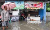 Pedagang menjaga warungnya saat terjadi banjir di Pondok Karya, Mampang, Jakarta Selatan, Kamis (4/1/2024). Banjir setinggi 80 sentimeter tersebut diakibatkan hujan dengan intensitas tinggi di wilayah Jakarta Selatan hingga membuat aliran air dari Kali Krukut meluap. (FOTO : Republika/Putra M. Akbar)