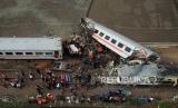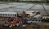 REPUBLIKA.CO.ID, CICALENGKA -- Foto udara saat petugas Tim SAR Gabungan melakukan proses evakuasi korban kereta api lokal Bandung Raya yang bertabrakan dengan kereta api Turangga di Cicalengka, Kabupaten Bandung, Jawa Barat, Jumat (5/1/2024). Tim SAR Gabungan berhasil mengevakuasi seluruh korban meninggal dunia kecelakaan rangkaian kereta api lokal Bandung Raya yang bertabrakan dengan kereta api Turangga. PT KAI menyatakan 4 orang meninggal dunia akibat kecelakaan tersebut. Penyebab kecelakaan hingga kini masih dalam proses penyelidikan.