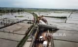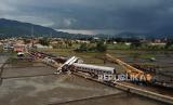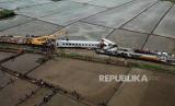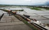 Foto udara proses evakuasi kereta api lokal Bandung Raya yang bertabrakan dengan kereta api Turangga di Cicalengka, Kabupaten Bandung, Jawa Barat, Jumat (5/1/2024). PT KAI menyatakan 4 orang meninggal dunia akibat kecelakaan tersebut. Penyebab kecelakaan hingga kini masih dalam proses penyelidikan. (FOTO : Republika/Edwin Dwi Putranto)