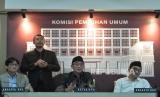 Ketua KPU Hasyim Asyari (tengah) memberikan keterangan pers terkait persiapan debat Pemilu 2024 di Gedung KPU, Jakarta, Jumat (5/1/2024). Komisi Pemilihan Umum (KPU) akan menggelar debat ketiga Pilpres 2024 dimana merupakan debat kedua antar capres yang akan digelar di Istora Senayan, Jakarta , Ahad (7/1/2024) malam. Debat tersebut mengangkat tema pertahanan, keamanan, hubungan internasional, globalisasi, geopolitik, dan politik luar negeri. (FOTO : Republika/Prayogi)