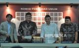 Ketua KPU Hasyim Asyari (dua kiri) bersama dengan para Anggota KPU usai memberikan keterangan pers terkait persiapan debat Pemilu 2024 di Gedung KPU, Jakarta, Jumat (5/1/2024). Komisi Pemilihan Umum (KPU) akan menggelar debat ketiga Pilpres 2024 dimana merupakan debat kedua antar capres yang akan digelar di Istora Senayan, Jakarta , Ahad (7/1/2024) malam. Debat tersebut mengangkat tema pertahanan, keamanan, hubungan internasional, globalisasi, geopolitik, dan politik luar negeri. (FOTO : Republika/Prayogi)