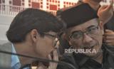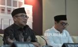 Ketua KPU Hasyim Asyari (kiri) memberikan keterangan pers terkait persiapan debat Pemilu 2024 di Gedung KPU, Jakarta, Jumat (5/1/2024). Komisi Pemilihan Umum (KPU) akan menggelar debat ketiga Pilpres 2024 dimana merupakan debat kedua antar capres yang akan digelar di Istora Senayan, Jakarta , Ahad (7/1/2024) malam. Debat tersebut mengangkat tema pertahanan, keamanan, hubungan internasional, globalisasi, geopolitik, dan politik luar negeri. (FOTO : Republika/Prayogi)