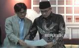 Ketua KPU Hasyim Asyari berbincang bersama Anggota KPU August Mellaz saat memberikan keterangan pers terkait persiapan debat Pemilu 2024 di Gedung KPU, Jakarta, Jumat (5/1/2024). Komisi Pemilihan Umum (KPU) akan menggelar debat ketiga Pilpres 2024 dimana merupakan debat kedua antar capres yang akan digelar di Istora Senayan, Jakarta , Ahad (7/1/2024) malam. Debat tersebut mengangkat tema pertahanan, keamanan, hubungan internasional, globalisasi, geopolitik, dan politik luar negeri. (FOTO : Republika/Prayogi)