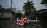 REPUBLIKA.CO.ID, TANGSEL Petugas BPBD Tangerang Selatan mengevakuasi warga Panti Asuhan Aria Putra di Ciputat, Tangerang Selatan, Banten, Sabtu (6/1/2024). Panti asuhan tersebut telah terendam banjir sejak Jumat (5/1) akibat intensitas hujan tinggi dan meluapnya saluran air, sementara sekitar 40 anak asuh dievakuasi ke tempat yang lebih aman.