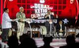 Capres nomor urut 2 Prabowo Subianto didampingi Cawapres nomor urut 2 Gibran Rakabuming Raka bersalaman dengan Capres nomor urut 1 Anies Baswedan saat debat capres di Istora Senayan, Jakarta, Ahad (7/1/2024). Debat ketiga Pilpres 2024 yang diikuti oleh ketiga kandidat calon presiden tersebut bertema pertahanan, keamanan, geopolitik, hubungan internasional dan politik luar negeri. (FOTO : Republika/Putra M. Akbar)