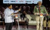 Capres nomor urut 2 Prabowo Subianto beradu gagasan dengan capres nomor urut 3 Ganjar Pranowo saat debat capres di Istora Senayan, Jakarta, Ahad (7/1/2024). Debat ketiga Pilpres 2024 yang diikuti oleh ketiga kandidat calon presiden tersebut bertema pertahanan, keamanan, geopolitik, hubungan internasional dan politik luar negeri. (FOTO : Republika/Putra M. Akbar)