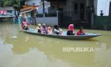 Warga menumpang ojek perahu untuk melintasi banjir yang merendam kampung Cijagra, Kecamatan Bojongsoang, Kabupaten Bandung, akibat luapan sungai Citarum, Senin (8/1/2023). Banjir kembali melanda sejumlah wilayah akibat luapan Sungai Citarum dan luapan sungai yang bermuara ke Citarum seperti Cikapundung dan Cipalasari di wilayah Kecamatan Dayeuhkolot, Baleendah dan Bojongsoang, Kabupaten Bandung. Luapan sungai terjadi lantaran hujan lebat yang terjadi sejak Ahad (7/1/2023). (FOTO : Edi Yusuf/Republika)