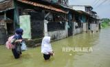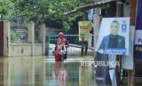 Warga melintasi jalan yang sudah terendam banjir di kampung Bojongasih, Kecamatan Dayeuhkolot, Kabupaten Bandung, akibat luapan sungai Citarum, Senin (8/1/2023). Banjir kembali melanda sejumlah wilayah akibat luapan Sungai Citarum dan luapan sungai yang bermuara ke Citarum seperti Cikapundung dan Cipalasari di wilayah Kecamatan Dayeuhkolot, Baleendah dan Bojongsoang, Kabupaten Bandung. Luapan sungai terjadi lantaran hujan lebat yang terjadi sejak Ahad (7/1/2023). (FOTO : Edi Yusuf/Republika)