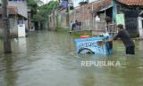 Pedagang melintasi jalan yang sudah terendam banjir di kampung Cijagra, Kecamatan Bojongsoang, Kabupaten Bandung, akibat luapan sungai Citarum, Senin (8/1/2023). Banjir kembali melanda sejumlah wilayah akibat luapan Sungai Citarum dan luapan sungai yang bermuara ke Citarum seperti Cikapundung dan Cipalasari di wilayah Kecamatan Dayeuhkolot, Baleendah dan Bojongsoang, Kabupaten Bandung. Luapan sungai terjadi lantaran hujan lebat yang terjadi sejak Ahad (7/1/2023). (FOTO : Edi Yusuf/Republika)