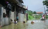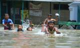 Anak-anak bermain di jalan yang sudah terendam banjir di kampung Cijagra, Kecamatan Bojongsoang, Kabupaten Bandung, akibat luapan sungai Citarum, Senin (8/1/2023). Banjir kembali melanda sejumlah wilayah akibat luapan Sungai Citarum dan luapan sungai yang bermuara ke Citarum seperti Cikapundung dan Cipalasari di wilayah Kecamatan Dayeuhkolot, Baleendah dan Bojongsoang, Kabupaten Bandung. Luapan sungai terjadi lantaran hujan lebat yang terjadi sejak Ahad (7/1/2023). (FOTO : Edi Yusuf/Republika)