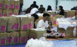 Pekerja melakukan penyortiran dan pelipatan surat suara Pemilihan Umum (Pemilu) 2024 di Gudang Logistik KPU, Kota Bandung, Jawa Barat, Senin (8/1/2024). Komisi Pemilihan Umum (KPU) Kota Bandung, memulai penyortiran dan pelipatan surat suara Pemilu 2024 dengan melibatkan sebanyak 1.072 orang pekerja yang direkrut dari seluruh kecamatan di Kota Bandung. Penyortiran dan pelipatan surat suara tersebut berlangsung hingga tanggal 18 Januari 2024. (FOTO : Edi Yusuf/Republika)