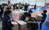 Petugas KPU membereskan surat suara usai dilakukan penyortiran dan pelipatan surat suara Pemilihan Umum (Pemilu) 2024 di Gudang Logistik KPU, Kota Bandung, Jawa Barat, Senin (8/1/2024). Komisi Pemilihan Umum (KPU) Kota Bandung, memulai penyortiran dan pelipatan surat suara Pemilu 2024 dengan melibatkan sebanyak 1.072 orang pekerja yang direkrut dari seluruh kecamatan di Kota Bandung. Penyortiran dan pelipatan surat suara tersebut berlangsung hingga tanggal 18 Januari 2024. (FOTO : Edi Yusuf/Republika)