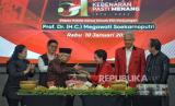 Calon presiden nomor urut 3 Ganjar Pranowo menyampaikan ucapan selamat dalam perayaan HUT Ke -51 PDI Perjuangan di Sekolah Partai DPP PDIP, Lenteng Agung, Jakarta, Rabu (10/1/2024). Tema yang diusung di HUT ke-51 PDIP yaitu Satyam Eva Jayate, Kebenaran Pasti Menang. (FOTO : Republika/Prayogi)