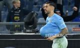 Pemain Lazio Mattia Zaccagni melakukan selebrasi seusai mencetak gol ke gawang Roma pada pertandingan sepak bola perempat final Coppa Italia di Stadion Olimpiade Roma, Rabu (10/1/2024) waktu setempat. Pada pertandingan itu Biancoceleste mengalahkan Roma dengan skor 1-0 sekaligus melaju ke babak semifinal Coppa Italia. Gol Lazio dicetak Mattia Zaccagni lewat titik penalti di menit ke-51. (FOTO : EPA-EFE/ETTORE FERRARI)