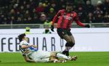 Pemain Atalanta Ederson (kanan) terjatuh saat berebut bola dengan pemain Milan Yunus Musah pada pertandingan sepak bola perempat final Coppa Italia di stadion San Siro, Milan, Rabu (10/1/2024) waktu setempat. Rossoneri takluk 1-2 dari Atalanta. AC Milan sempat unggul lebih dulu lewat kaki Rafael Leao di menit ke-45. Selang dua menit, Atalanta membalas lewat Teun Koopmeiners. Gol kemenangan Atalanta lahir di menit ke-59 yang dicetak Koopmeiners. (FOTO : AP Photo/Luca Bruno)