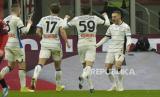 Pemain Atalanta Teun Koopmeiners (kanan) melakukan selebrasi seusai mencetak gol ke gawang AC Milan pada pertandingan sepak bola perempat final Coppa Italia di stadion San Siro, Milan, Rabu (10/1/2024) waktu setempat. Rossoneri takluk 1-2 dari Atalanta. AC Milan sempat unggul lebih dulu lewat kaki Rafael Leao di menit ke-45. Selang dua menit, Atalanta membalas lewat Teun Koopmeiners. Gol kemenangan Atalanta lahir di menit ke-59 yang dicetak Koopmeiners. (FOTO : AP Photo/Luca Bruno)
