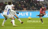 Pemain Milan Christian Pulisic (kanan) melepaskan tendangan ke gawang Atalanta pada pertandingan sepak bola perempat final Coppa Italia di stadion San Siro, Milan, Rabu (10/1/2024) waktu setempat. Rossoneri takluk 1-2 dari Atalanta. AC Milan sempat unggul lebih dulu lewat kaki Rafael Leao di menit ke-45. Selang dua menit, Atalanta membalas lewat Teun Koopmeiners. Gol kemenangan Atalanta lahir di menit ke-59 yang dicetak Koopmeiners. (FOTO : AP Photo/Luca Bruno)