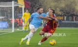Pemain Roma Edoardo Bove (kanan) berebut bola dengan pemain Lazio Manuel Lazzari pada pertandingan sepak bola perempat final Coppa Italia di Stadion Olimpiade Roma, Rabu (10/1/2024) waktu setempat. Pada pertandingan itu Biancoceleste mengalahkan Roma dengan skor 1-0 sekaligus melaju ke babak semifinal Coppa Italia. Gol Lazio dicetak Mattia Zaccagni lewat titik penalti di menit ke-51. (FOTO : AP Photo/Gregorio Borgia)