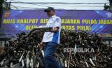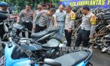 Kakorlantas Polri, Irjen Pol Aan Suhanan, didampingi Kapolrestabes Bandung Kombes Pol Budi Sartono, dan Dirlantas Polda Jawa Barat, Kombes Pol Wibowo meninjau sepeda motor dan ratusan knalpot brong hasil razia usai menyampaikan keterangan pers rilis knalpot bising di halaman Polrestabes Bandung, Jalan Merdeka, Kota Bandung, Jawa Barat, Kamis (11/1/2024). Irjen Pol Aan Suhanan, menyebut sudah ada 430 ribu knalpot brong yang diamankan jajaran Polres dan Polda se-Indonesia. Di Kota Bandung razia knalpot dilakukan secara serentak mulai 10 Januari hingga 20 Januari 2024. Selain untuk menciptakan rasa nyaman bagi masyarakat, juga untuk menciptakan situasi yang kondusif saat memasuki masa kampanye terbuka. (FOTO : Edi Yusuf/Republika)