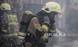 Petugas Damkar memakai pakaian alat pelindung diri usai memasuki lokasi kebakaran di Jalan Minangkabau, Setiabudi, Jakarta Selatan, Kamis (11/1/2024). Sebanyak 22 unit mobil pemadam kebakaran dan 100 personel damkar dikerahkan untuk memadamkan kebakaran bangunan yang diduga akibat korsleting listrik. (FOTO : Republika/Putra M. Akbar)