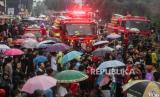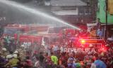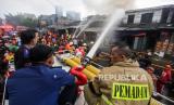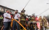 Petugas Damkar dibantu oleh pelajar berusaha memadamkan api saat kebakaran di Jalan Minangkabau, Setiabudi, Jakarta Selatan, Kamis (11/1/2024). Sebanyak 22 unit mobil pemadam kebakaran dan 100 personel damkar dikerahkan untuk memadamkan kebakaran bangunan yang diduga akibat korsleting listrik. (FOTO : Republika/Putra M. Akbar)