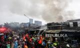 Warga menyaksikan petugas Damkar berusaha memadamkan api saat kebakaran di Jalan Minangkabau, Setiabudi, Jakarta Selatan, Kamis (11/1/2024). Sebanyak 22 unit mobil pemadam kebakaran dan 100 personel damkar dikerahkan untuk memadamkan kebakaran bangunan yang diduga akibat korsleting listrik. (FOTO : Republika/Putra M. Akbar)