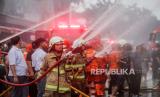 Petugas Damkar berusaha memadamkan api saat kebakaran di Jalan Minangkabau, Setiabudi, Jakarta Selatan, Kamis (11/1/2024). Sebanyak 22 unit mobil pemadam kebakaran dan 100 personel damkar dikerahkan untuk memadamkan kebakaran bangunan yang diduga akibat korsleting listrik. (FOTO : Republika/Putra M. Akbar)