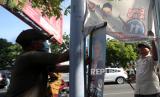 Panitia pengawas pemilihan (panwaslih) dan Satpol PP Kota Banda Aceh menertibkan alat peraga kampanye (APK) caleg, DPD, capres dan cawapres serta partai politik (parpol) peserta pemilu 2024 di Banda Aceh, Aceh, Kamis (11/1/2024). Penertiban APK tersebut dilakukan karena pemasangannya tidak sesuai dengan peraturan KPU, memasang di jalan protokol, memaku dipohon dan menggunakan tiang listrik, telkom serta tiang rambu lalulintas. (FOTO : ANTARA FOTO/Irwansyah Putra)