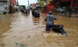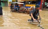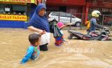 Banjir cukup tinggi kembali menerjang sejumlah wilayah di Kabupaten Bandung, seperti Kecamatan Dayeuhkolot, Baleendah, dan Bojongsoang, Jumat (12/1/2024). Banjir disebabkan meluapnya Sungai Citarum dan sungai-sungai yang bermuara ke Citarum. Tingginya banjir menyebabkan akses jalan ke Kota Bandung terputus. (FOTO : Edi Yusuf/Republika)