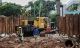 Pekerja beraktivitas di area proyek pembangunan fasilitas gedung tambahan Rumah Pompa Kemang, Jalan Kemang Raya, Bangka, Mampang Prapatan, Jakarta Selatan, Jumat (12/1/2024). Penjabat Gubernur DKI Jakarta Heru Budi Hartono sempat melakukan peninjauan proyek ini pada Kamis (11/1) kemarin, dia memastikan proses pembangunan akan rampung tepat waktu yakni pada Maret tahun ini. Penambahan rumah pompa ini diharapkan mampu mengatasi banjir yang sering terjadi di kawasan Kemang saat musim hujan. (FOTO : Republika/Thoudy Badai)