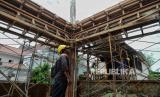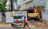 Pedagang melintas di area proyek pembangunan fasilitas gedung tambahan Rumah Pompa Kemang, Jalan Kemang Raya, Bangka, Mampang Prapatan, Jakarta Selatan, Jumat (12/1/2024). Penjabat Gubernur DKI Jakarta Heru Budi Hartono sempat melakukan peninjauan proyek ini pada Kamis (11/1) kemarin, dia memastikan proses pembangunan akan rampung tepat waktu yakni pada Maret tahun ini. Penambahan rumah pompa ini diharapkan mampu mengatasi banjir yang sering terjadi di kawasan Kemang saat musim hujan. (FOTO : Republika/Thoudy Badai)