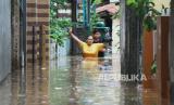 Warga melintasi gang yang merendam salah satu perkampungan di Dayeuhkolot, Kabupaten Bandung, Jumat (12/1/2024). (FOTO : Edi Yusuf/Republika)