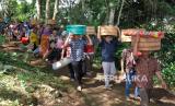 Warga mengusung tenong berisi berbagai jenis makanan saat tradisi Nyadran Perdamaian di Krecek, Getas, Kaloran, Temanggung, Jateng, Jumat (12/1/2024). Tradisi nyadran atau merti dusun yang diikuti penganut agama Islam, Budha, dan Katolik tersebut merupakan tradisi turun temurun sebagai bentuk toleransi dan kerukunan warga lintas agama sekaligus berdoa untuk kelancaran Pemilu 2024. (FOTO : ANTARA FOTO/Anis Efizudin)