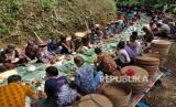 Sejumlah warga menyantap makanan bersama saat tradisi Nyadran Perdamaian di Krecek, Getas, Kaloran, Temanggung, Jateng, Jumat (12/1/2024). Tradisi nyadran atau merti dusun yang diikuti penganut agama Islam, Budha, dan Katolik tersebut merupakan tradisi turun temurun sebagai bentuk toleransi dan kerukunan warga lintas agama sekaligus berdoa untuk kelancaran Pemilu 2024. (FOTO : ANTARA FOTO/Anis Efizudin)