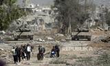 Warga Palestina mengungsi ke Gaza utara ketika tank-tank Israel memblokir jalan Salah al-Din di Jalur Gaza tengah pada hari Jumat, (24/11/2023). (FOTO : AP Photo/Mohammed Dahman)