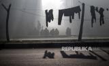 Pakaian digantung di kawat saat penduduk kamp pengungsi Al Nusairat dan Al Bureij menunggu untuk dievakuasi menyusul peringatan Israel akan peningkatan operasi militer di kamp-kamp di jalur Gaza, (26/12/2023) (FOTO : EPA-EFE/MOHAMMED SABER)