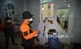 Relawan membagikan masker kepada jamaah masjid akibat hujan abu vulkanik, di Pokso Bencana Gunung Marapi, Batang Silasiah, Nagari Bukik Batabuah, Agam, Sumatera Barat, Sabtu (13/1/2024). Pos Pengamatan Gunung Api Marapi di Bukittinggi mencatat gunung tersebut kembali erupsi pada Sabtu (13/1/2024) pukul 19.33 WIB yang menyebabkan hujan abu di sekitar kaki gunung yang kini berstatus siaga level III itu. (FOTO : ANTARA FOTO/Iggoy el Fitra)