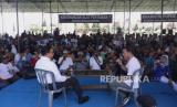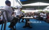 Calon Presiden nomor urut 1 Anies Baswedan (kanan) mendengarkan keluhan petani saat Rembuk Tani Lampung Timur di Lapangan Sidorejo, Sekampung Udik, Lampung Timur, Ahad (14/1/2024). Pada kesempatan tersebut Anies Baswedan berdiskusi dengan kelompok petani setempat mengenai kendala yang dialami di bidang pertanian dan memprioritaskan penanganan permasalahan pangan dengan membentuk tim khusus yang akan mengurus tata niaga pangan. (FOTO : Republika/Putra M. Akbar)