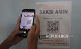 Simpatisan memindai kode batang untuk mendaftarkan diri menjadi Saksi AMIN di GOR Podomoro Natar, Lampung Selatan, Ahad (14/1/2024). Pada acara tersebut Anies Baswedan berpesan kepada saksi dan simpatisan AMIN untuk mengawasi proses penghitungan suara Pilpres 2024 di Tempat Pemungutan Suara (TPS) setempat agar tidak terjadi kecurangan. (FOTO : Republika/Putra M. Akbar)