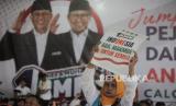 Simpatisan menunjukan poster dukungan untuk Calon Presiden nomor urut 1 Anies Baswedan saat Jumpa Saksi AMIN dan Simpatisan di GOR Podomoro Natar, Lampung Selatan, Ahad (14/1/2024). Pada acara tersebut Anies Baswedan berpesan kepada saksi dan simpatisan AMIN untuk mengawasi proses penghitungan suara Pilpres 2024 di Tempat Pemungutan Suara (TPS) setempat agar tidak terjadi kecurangan. (FOTO : Republika/Putra M. Akbar)