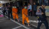 Polisi menggiring salah satu tersangka usia dewasa anggota gengster saat gelar kasus di Mapolres Batang, Jawa Tengah, Senin (15/1/2024). Polres Batang berhasil menangkap 9 orang anggota gengster bernama Tamtama dengan 8 diantaranya masih dibawah umur (pelajar setingkat SMA) dan satu orang dewasa dengan kasus kekerasan aksi tawuran antar pelajar bermotif merencanakan aksi itu melalui media sosial. (FOTO : ANTARA FOTO/Harviyan Perdana Putra)