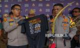Kapolres Batang AKBP Saufi Salamun (kiri) menunjukkan kaos bertuliskan Tamtama 54 Gangster yang digunakan sebagai identitas kelompok saat gelar kasus kekerasan di Mapolres Batang, Jawa Tengah, Senin (15/1/2024). Polres Batang berhasil menangkap 9 orang anggota gengster bernama Tamtama dengan 8 diantaranya masih dibawah umur (pelajar setingkat SMA) dan satu orang dewasa dengan kasus kekerasan aksi tawuran antar pelajar bermotif merencanakan aksi itu melalui media sosial. (FOTO : ANTARA FOTO/Harviyan Perdana Putra)